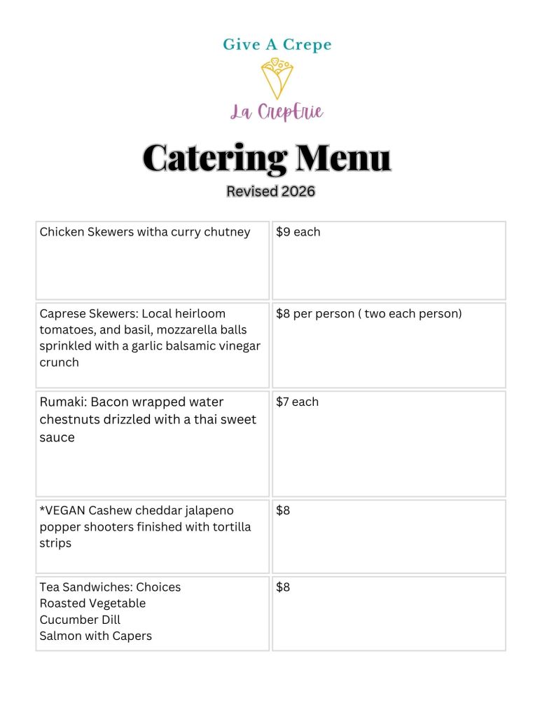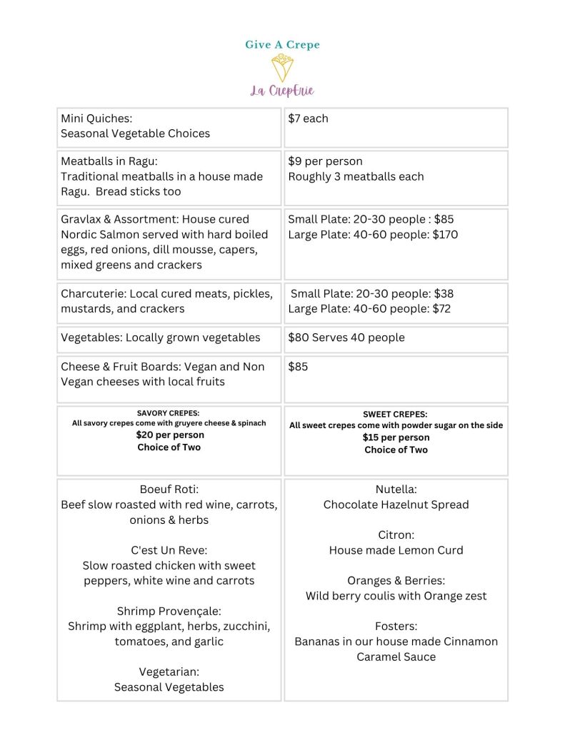 We set out to bring the celebration to you, no hassle, more tassels! All of our catering events are up to 100 people, making the small and intimate a reality. From baby showers, wedding rehearsal dinners, or a special dinner with a chef for your guests; let us give a crepe about the things you do! Each menu is created with you and your theme in mind.