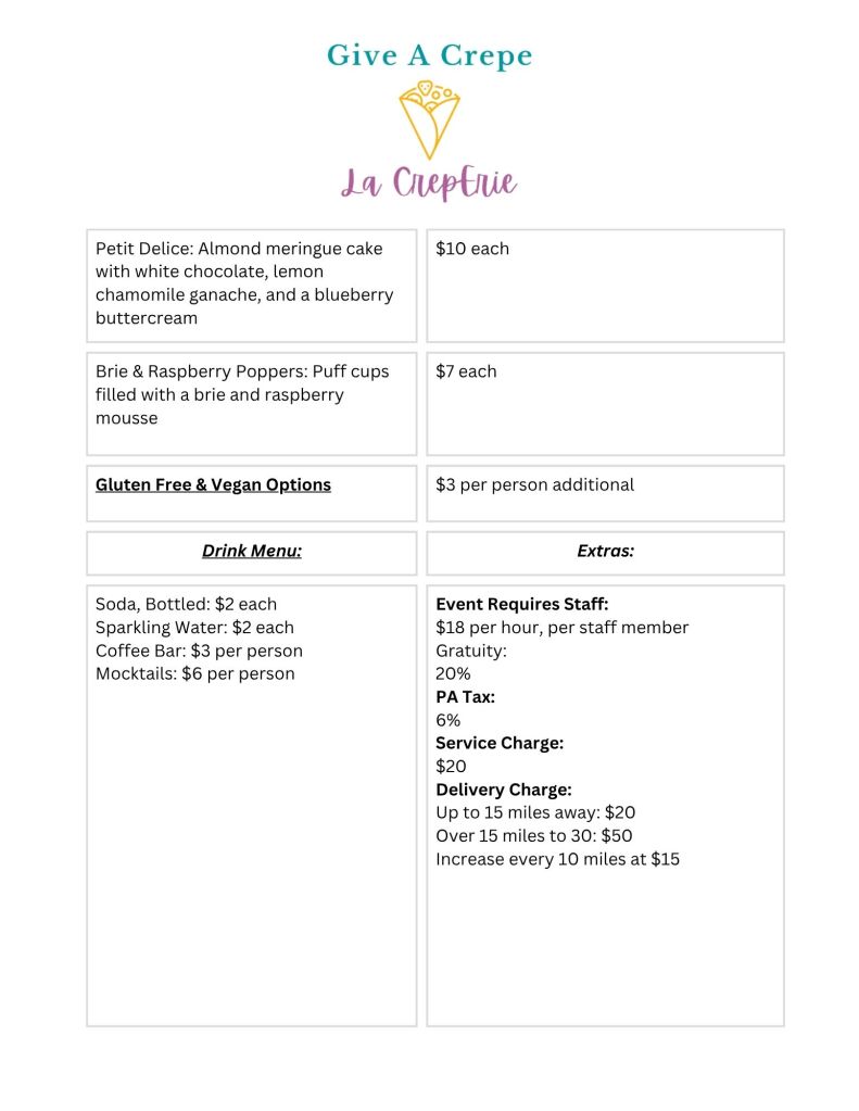 - Our pricing reflects the up most care in presentation, service, and professionalism. If there are any allergen needs to be addressed, easily worked with.